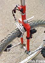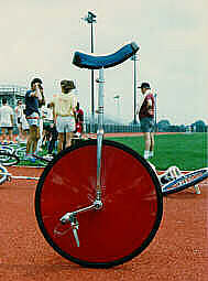 Here are some specials. They don't fit any of the typical niches. Some are variations on the standard unicycle, and others, well, see for yourself! This MUni belongs to Leo White, and was photographed at UNICON VIII in Guildford, UK. It has a fork-mounted computer which Leo describes as "just about viewable when riding." It also has a brake. This brake mechanism is specifically set up for riding downhill for long stretches while carrying a heavy pack. A bicycle gearshift lever is set for a constant level of braking, and adjusted as needed. Brakes for everyday riding are not practical, but this is a good idea for this specialized situation. Leo rode this unicycle in two Polaris Challenge events. This is a triple-spoked Schwinn. It was built by Bill Brichford for Mark Schaefer of the Redford Township Unicycle Club in 1982. The extra spokes added the stability that some racers like (but extra weight), and probably no extra strength, but they sure do look cool covered with the morning dew.