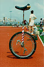 Special unicycles at UNICON II on Long Island in 1986. At left is a disk-wheeled racer, built and ridden by Floyd Beattie of Ohio. Floyd was into aerodynamics and wore a full skinsuit and an aero helmet, but his giant beard kind of canceled it all out. The usefulness of a disk wheel is debatable, due to the natural wobble that occurs when pedaling at high speeds. It also makes the unicycle difficult to ride in a crosswind. At right is a sort of "City Cycle", ridden by Harold Herzig of New Jersey. We met Harold in New York's Five Boro Bike Tour, where 20,000 cyclists ride through the whole city. He rode that thing (minus the chains), the whole 36 miles, within the time limit. How useful is that chain in the snow? I don't know but I'd like to find out. If you looked real close, you may have noticed that both of these unicycles sport full toe clips with straps. 99% of all unicyclists recommend not using these, but these two riders were comfortable with them. The "Excessory Cycle." Built by John Foss in 1981, it's what you get when you give a unicycle the works. Bells, lights, horns, pump, water bottle, rack, speedometer, fender, hood ornament, saddlebag, turn signals, safety flag, etc. All bike accessories from bike shops. The hard part was fitting everything on there and having it still be rideable! More recently, this unicycle had a spectacular tire blowout during the Sacramento Lights Parade in September, 1996. This was the tire that was on it when it was originally assembled. Taking it apart to change the tire will involve completely dismantling everything attached above the fork crown and unwrapping a lot of wires; a task John is not looking forward to . . . Peter Rosendahl, a professional performer from Sweden, is holding a very special variation on the giraffe. I call it a sideways zigzag. The frame goes up from the wheel, then turns 90° and goes horizontally for a bit, then turns 90° again and goes up to the pedals and seat. When ridden in a spin, it stands eerily upright. Then he rides it with his female partner standing on the flat part. This is the "Wild Monkey" cycle, brought to the 1996 NUC in Chariton, Iowa by Samson Gruss. The "handle" is a piece of chain pulled taught, and the monkey's feet are attached to the pedals so it looks like he's pedaling madly while Samson tries to restrain him. He rides at the crowd shouting "Wild monkey!!" and the kids scatter. This is the best use I've yet seen for a department store unicycle.