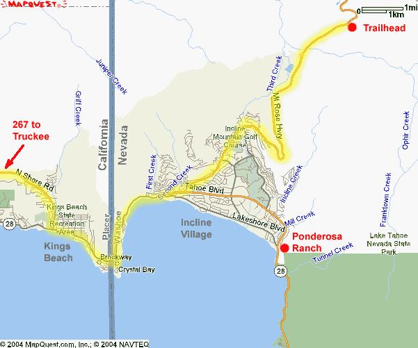 Driving down from the trailhead, follow Mt. Rose Highway back down, and turn left on Country Club Drive. This should be about 6 miles down from the trailhead. Country Club is a shortcut down to Highway 28. Turn left at the light onto 28 (Tahoe Blvd), and follow it down to the Ponderosa, 1 mile or less on your left.