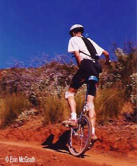 And finally, here I am cranking up the first hill of Salmon Falls Trail. Notice the knee pads, I'm getting smarter. Also check out the Camel Back, the black thing on my back. It holds 70 ounces of water, and has a tube to run around to your mouth. Very convenient for unicyclist since you don't have to get off to get to your water. Its especially nice for the hot Sacramento weather. I've ridden this trail when it was over 105 degrees, which means I spent a lot of time in the river! |