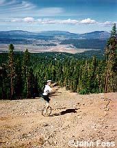 This picture was taken at Northstar Ski Resort near Tahoe California in the Sierra Nevada Mountains. There obviously isn't any snow, this is during the summer. The ski slopes are open to Mountain Bikers during the summer, but they didn't expect unicyclists! We are sitting at about 7500 feet at this point. The base is around 6500 and the top is around 8500ft . Thats a long way to uni! |