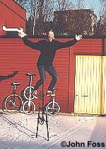 A pedoped is a walking machine. Don't ask me why you would need a machine to walk, but it sure is interesting to watch! This Pedoped belongs to Peter Holmgren of Järfalla, Sweden. He's seen riding it in his driveway in November 1983. You pedal the pedals and it walks. Snow? What snow? If you live in Sweden and ride outside, that's what you get! |