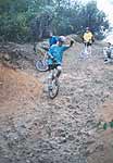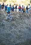 Holm tames the wall In '96, only George Peck could ride down this piece of the afternoon experts' Manzanita Trail. In '97, Brett Bymaster also did it. After tackling it himself, and then riding across the narrow wood plank immediately at the bottom, Kris was reported to say something like "What? Was there a steep part there?" George Peck, Julie Young, and Christopher Peck are back there helping us get an idea just how steep this place, featured on the '98 T-shirts, is. |