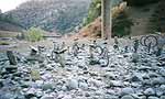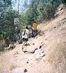 on the Clementine Trail The first part of the ride for the experts is the Clementine trail, upstream along the American River North Fork toward Clementine Dam. The trail gets narrow and the terrain steep as riders pass under the big Foresthill Bridge, which is far above them. Riders not wishing to ride uphill 1000 feet got dropped off near the top. |
